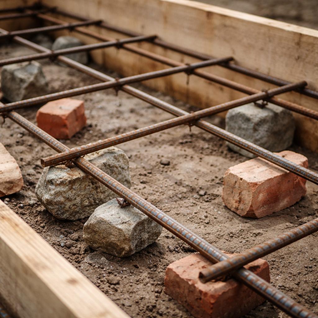 Дополнительный фактор — визуальная обманчивость. Многие подручные элементы выглядят достаточно жёсткими и устойчивыми в сухом виде. Камешки, куски кирпича, обрезки доски, пластик, металлический лом — всё это кажется способным «подпереть» арматуру. Но внешний вид здесь почти ничего не говорит о поведении в бетоне.